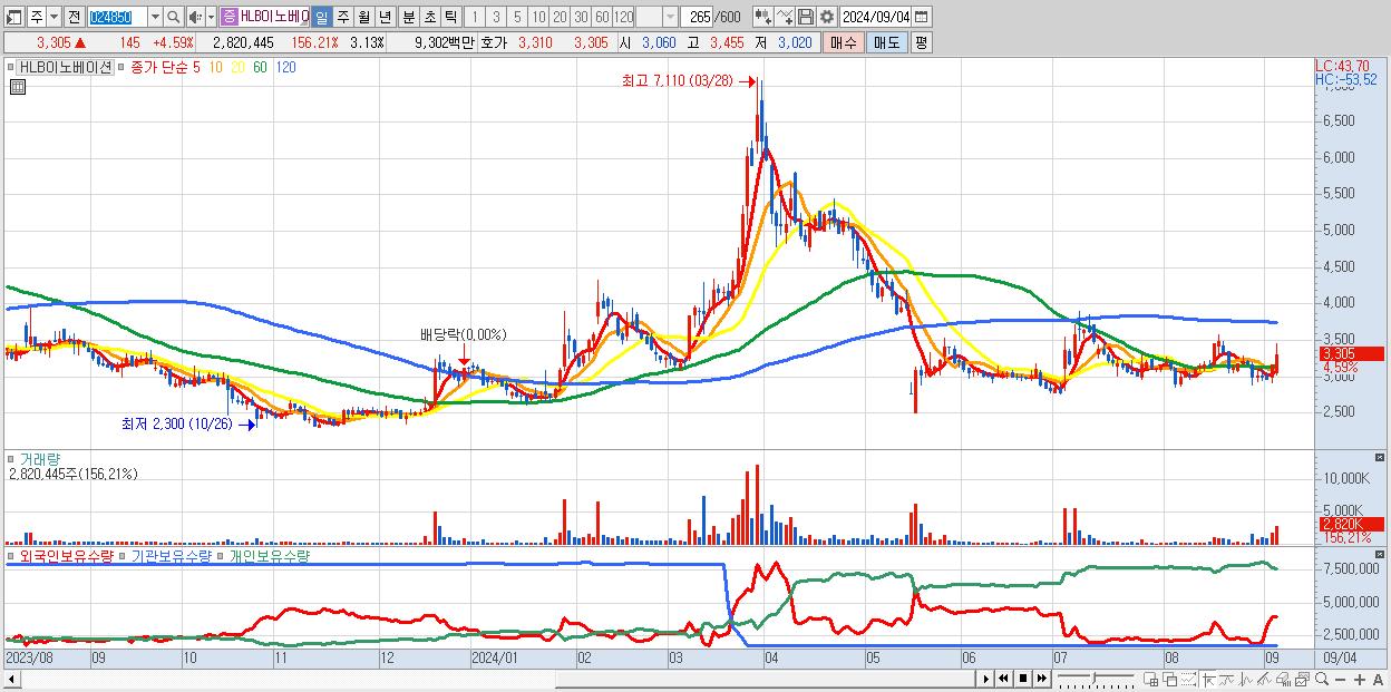 - HLB이노베이션 (3,305원 ▲ 4.59% , 시총: 2,979억, 거래량: 2,820,445, 거래대금:93억)