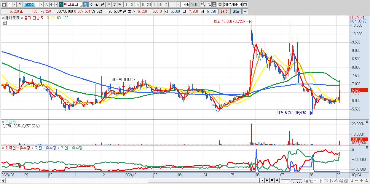 - 에너토크 (6,620원 ▲ 7.29% , 시총: 646억, 거래량: 3,870,189, 거래대금:265억)
