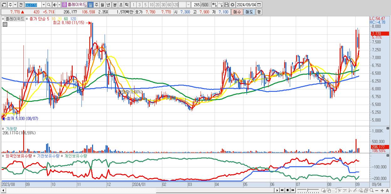 - 플레이위드 (7,770원 ▲ 5.71% , 시총: 681억, 거래량: 206,177, 거래대금:16억)