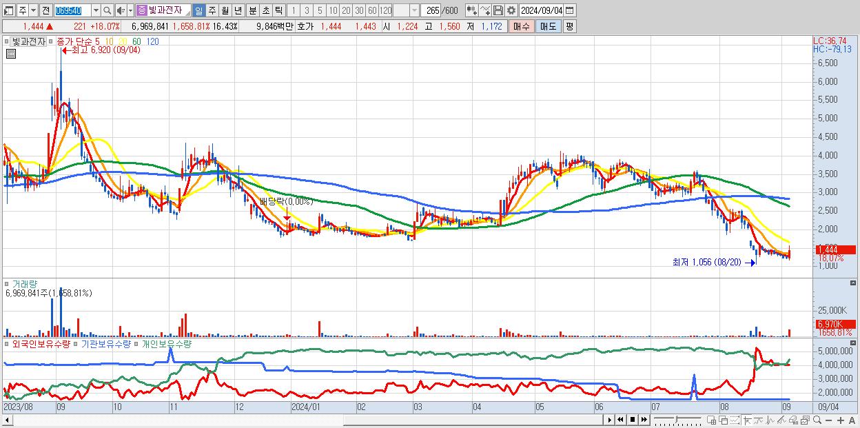 - 빛과전자 (1,444원 ▲ 18.07% , 시총: 613억, 거래량: 6,969,841, 거래대금:98억)