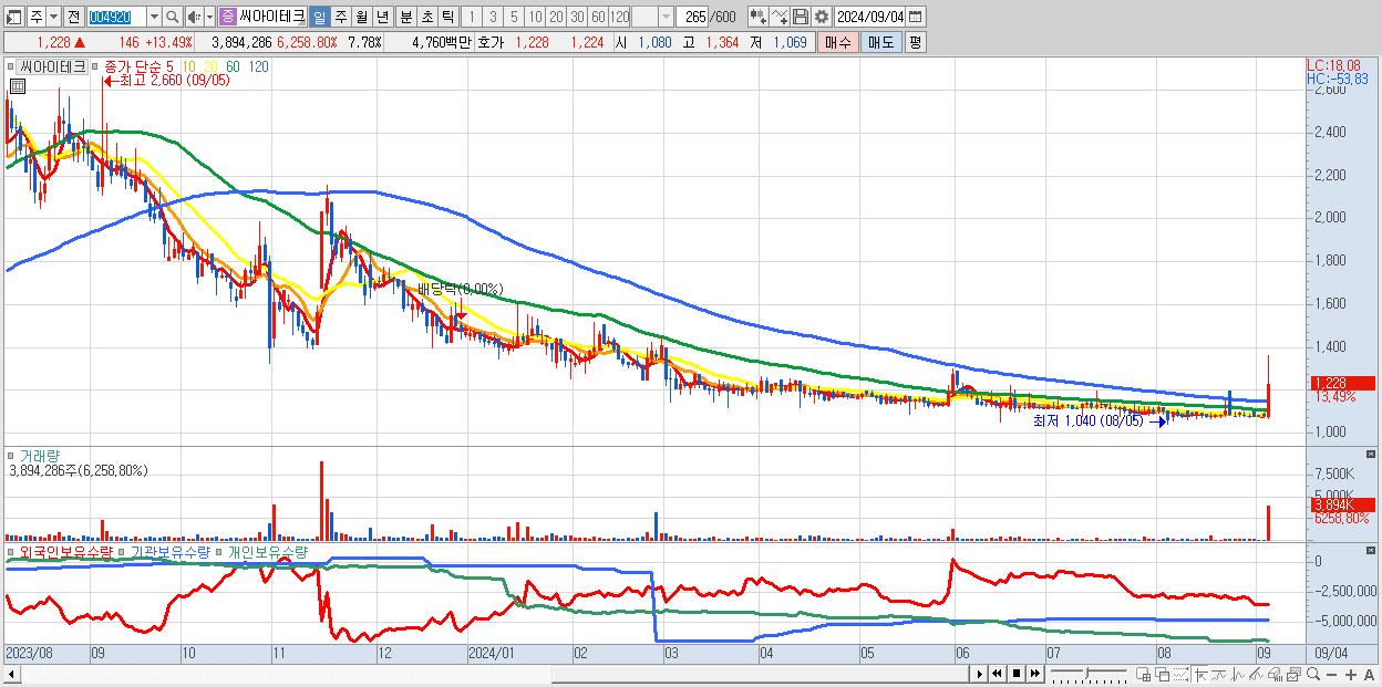 - 씨아이테크 (1,228원 ▲ 13.49% , 시총: 615억, 거래량: 3,894,286, 거래대금:48억)