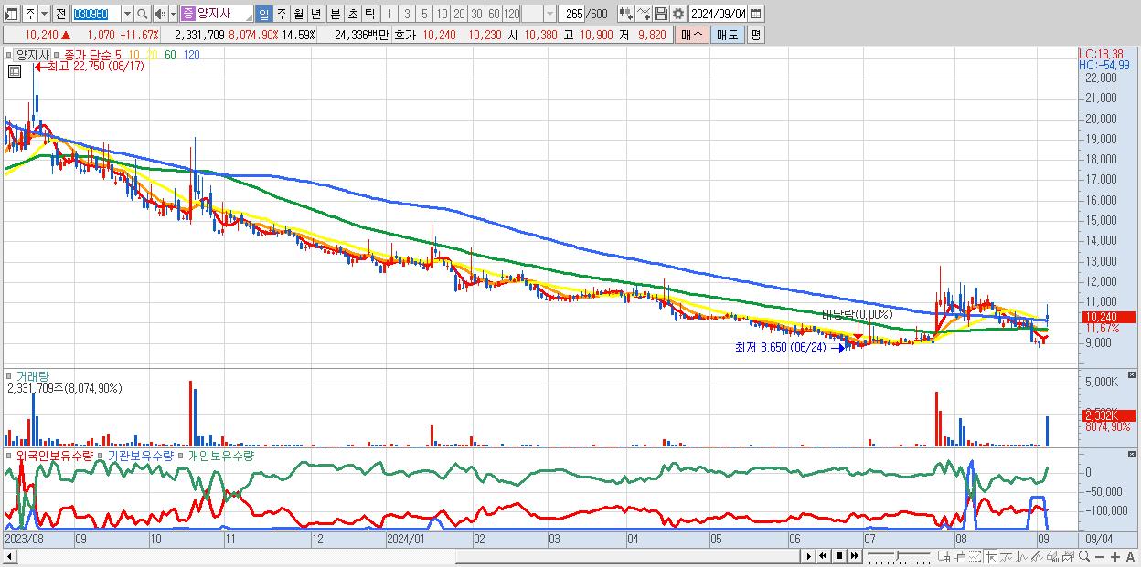 - 양지사 (10,240원 ▲ 11.67% , 시총: 1,636억, 거래량: 2,331,709, 거래대금:243억)