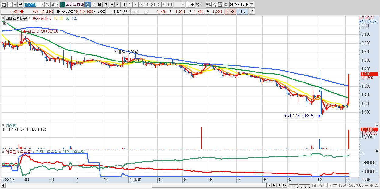- 코데즈컴바인 (1,640원 ▲ 29.95% , 시총: 621억, 거래량: 16,567,737, 거래대금:246억)