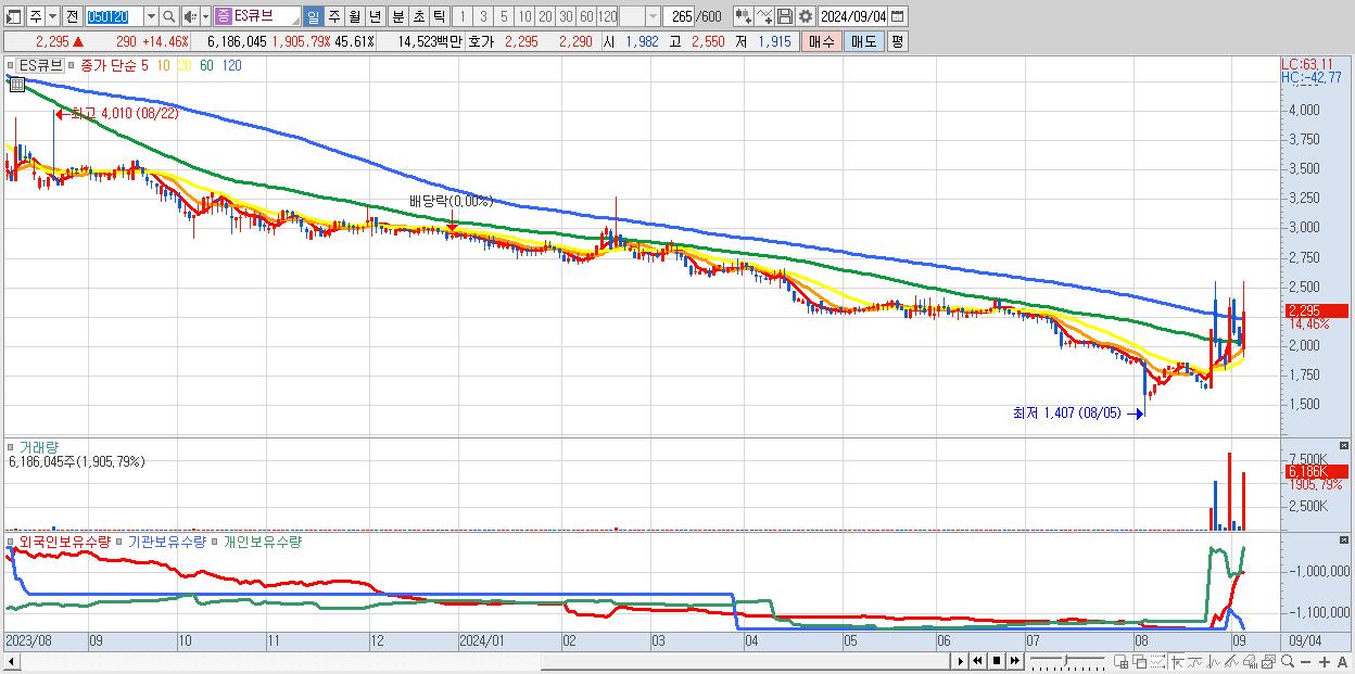 - ES큐브 (2,295원 ▲ 14.46% , 시총: 311억, 거래량: 6,186,045, 거래대금:145억)