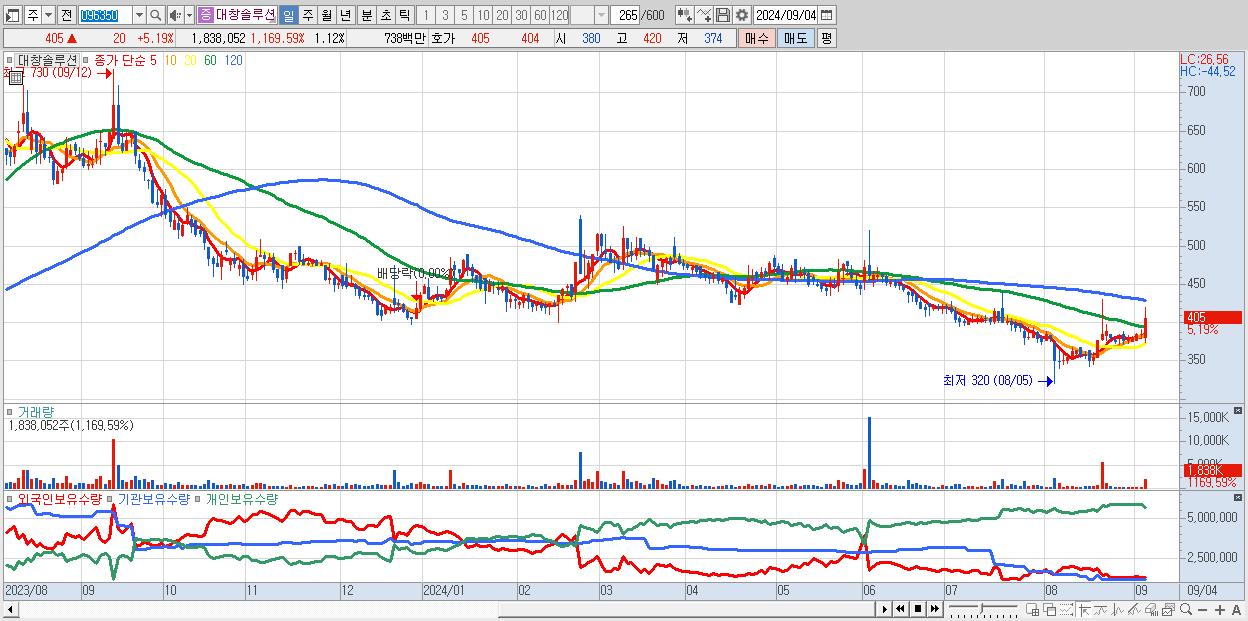 - 대창솔루션 (405원 ▲ 5.19% , 시총: 663억, 거래량: 1,838,052, 거래대금:7억)