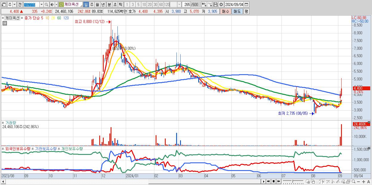 - 케이옥션 (4,400원 ▲ 8.24% , 시총: 1,198억, 거래량: 24,460,106, 거래대금:1,146억)