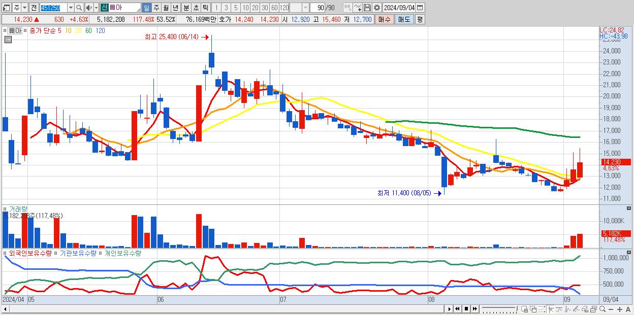 - 삐아 (14,230원 ▲ 4.63% , 시총: 1,378억, 거래량: 5,182,208, 거래대금:762억)