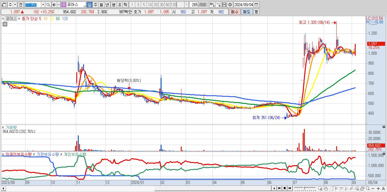 - 코아스 (1,097원 ▲ 10.25% , 시총: 361억, 거래량: 954,602, 거래대금:10억)