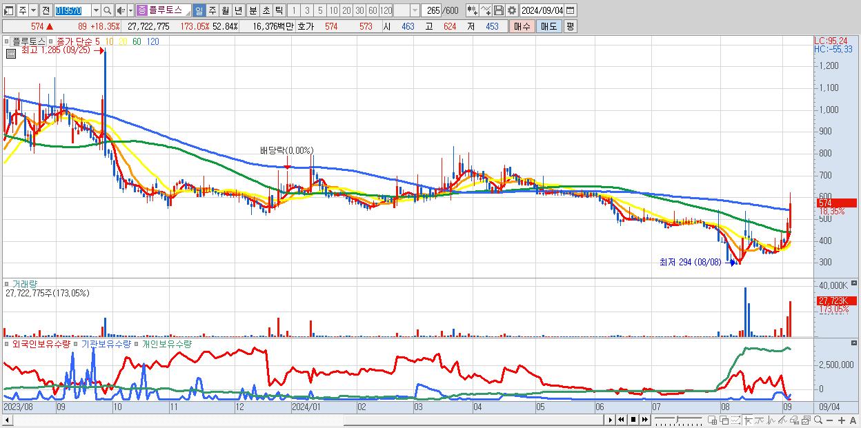 - 플루토스 (574원 ▲ 18.35% , 시총: 301억, 거래량: 27,722,775, 거래대금:164억)