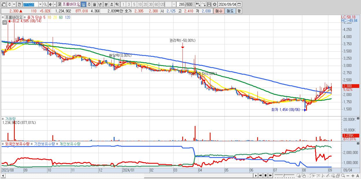 - 프롬바이오 (2,300원 ▲ 5.02% , 시총: 651억, 거래량: 1,234,902, 거래대금:28억)