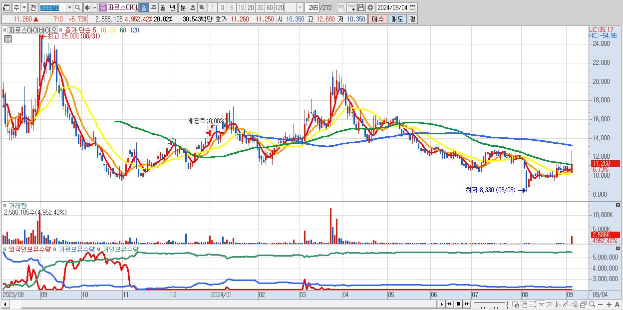 - 파로스아이바이오 (11,260원 ▲ 6.73% , 시총: 1,455억, 거래량: 2,586,105, 거래대금:305억)