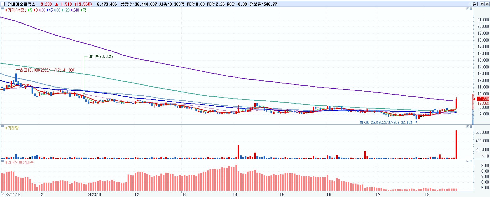 - 유바이오로직스 (9,230원 ▲ 19.56% , 시총: 3,364억, 거래량: 6,487,074, 거래대금:584억)