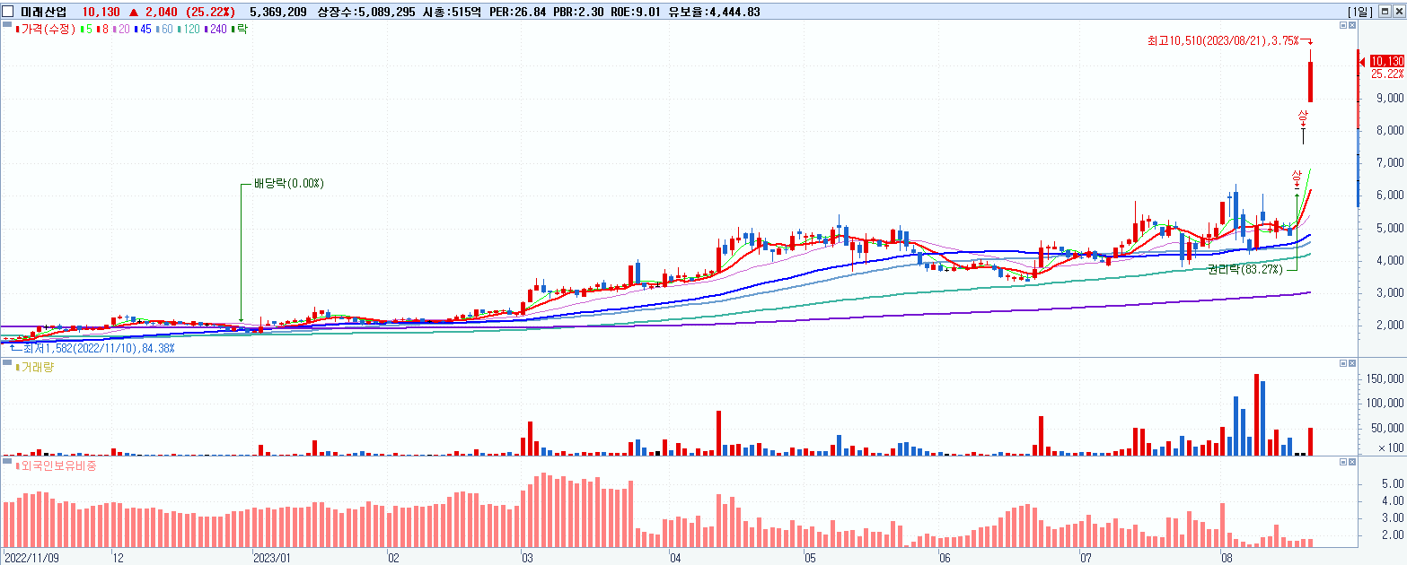 - 미래산업 (10,130원 ▲ 25.22% , 시총: 516억, 거래량: 5,372,722, 거래대금:534억)