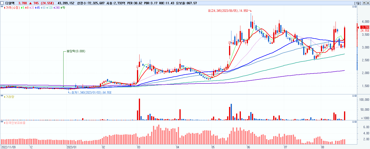 - 디알텍 (3,780원 ▲ 24.55% , 시총: 2,734억, 거래량: 43,457,819, 거래대금:1,549억)