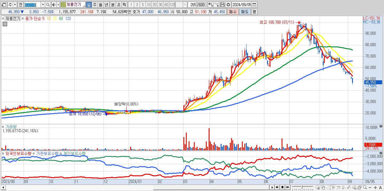 - 제룡전기 (46,950원 ▼ -7.58% , 시총: 7,541억, 외국인 순매수 거래금:51억)