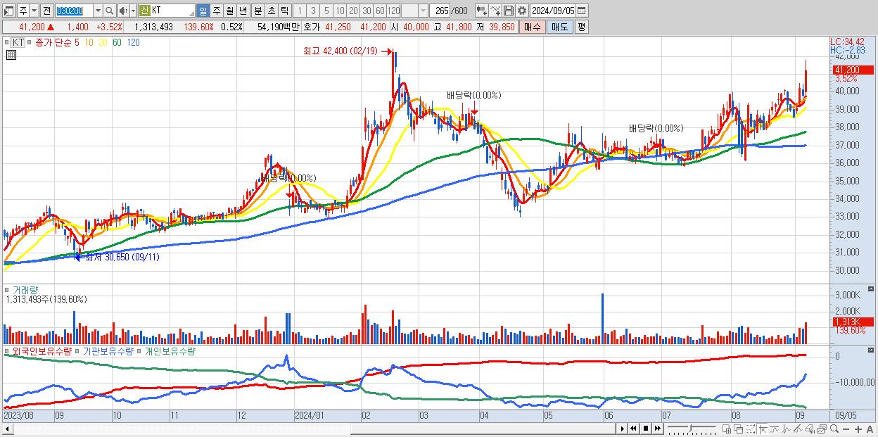 - KT (41,200원 ▲ 3.52% , 시총: 103,833억, 외국인 순매수 거래금:65억)