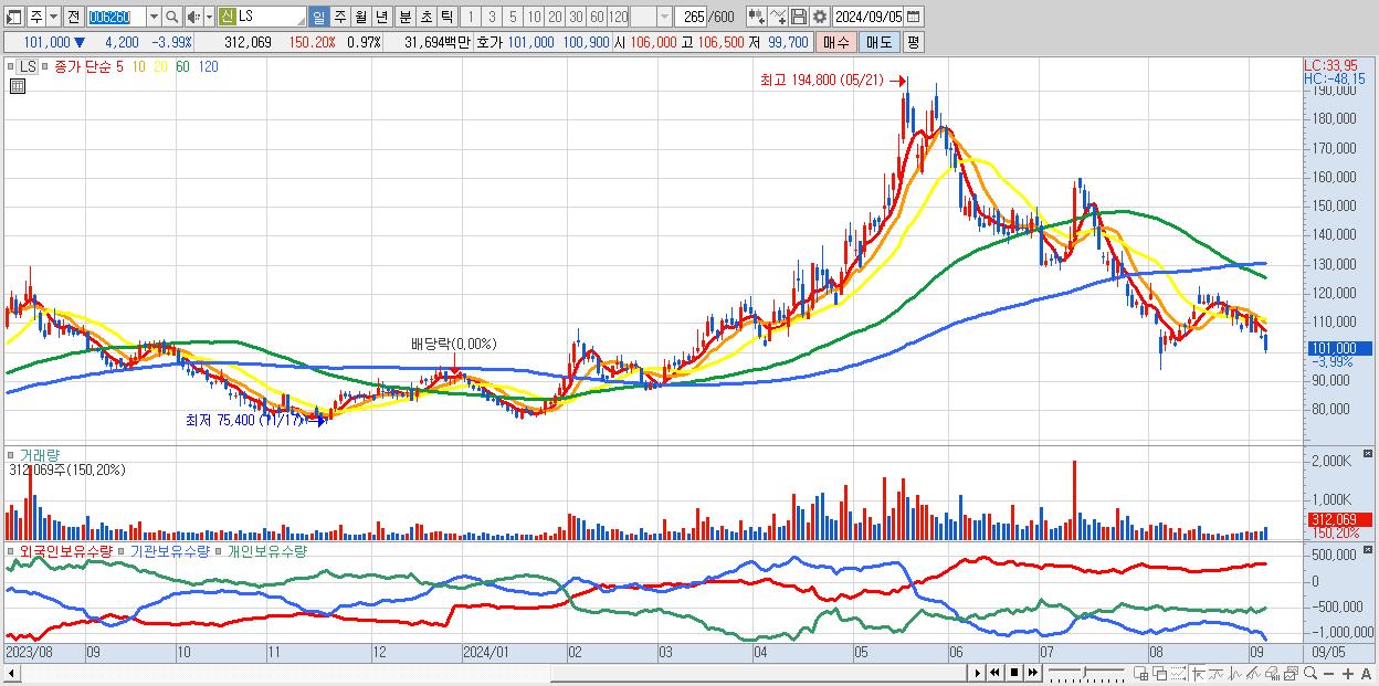 - LS (101,000원 ▼ -3.99% , 시총: 32,522억, 외국인 순매수 거래금:102억)