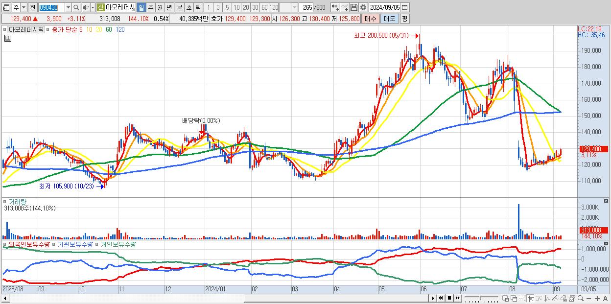 - 아모레퍼시픽 (129,400원 ▲ 3.11% , 시총: 75,690억, 외국인 순매수 거래금:100억)
