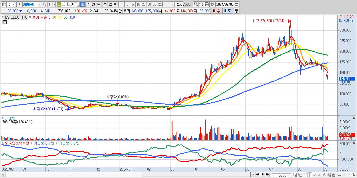 - LS ELECTRIC (135,900원 ▼ -4.83% , 시총: 40,770억, 외국인 순매수 거래금:265억)