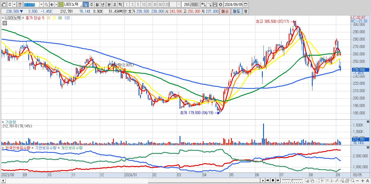 - LG이노텍 (238,500원 ▼ -1.45% , 시총: 56,446억, 외국인 순매수 거래금:56억)