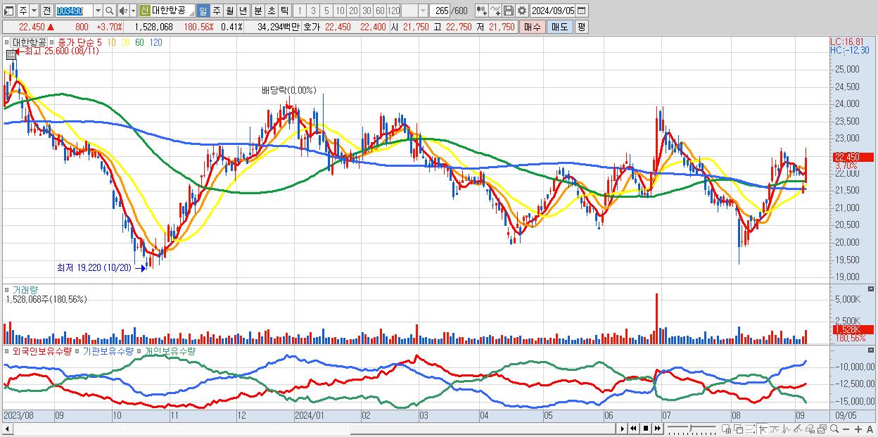 - 대한항공 (22,450원 ▲ 3.7% , 시총: 82,666억, 외국인 순매수 거래금:41억)
