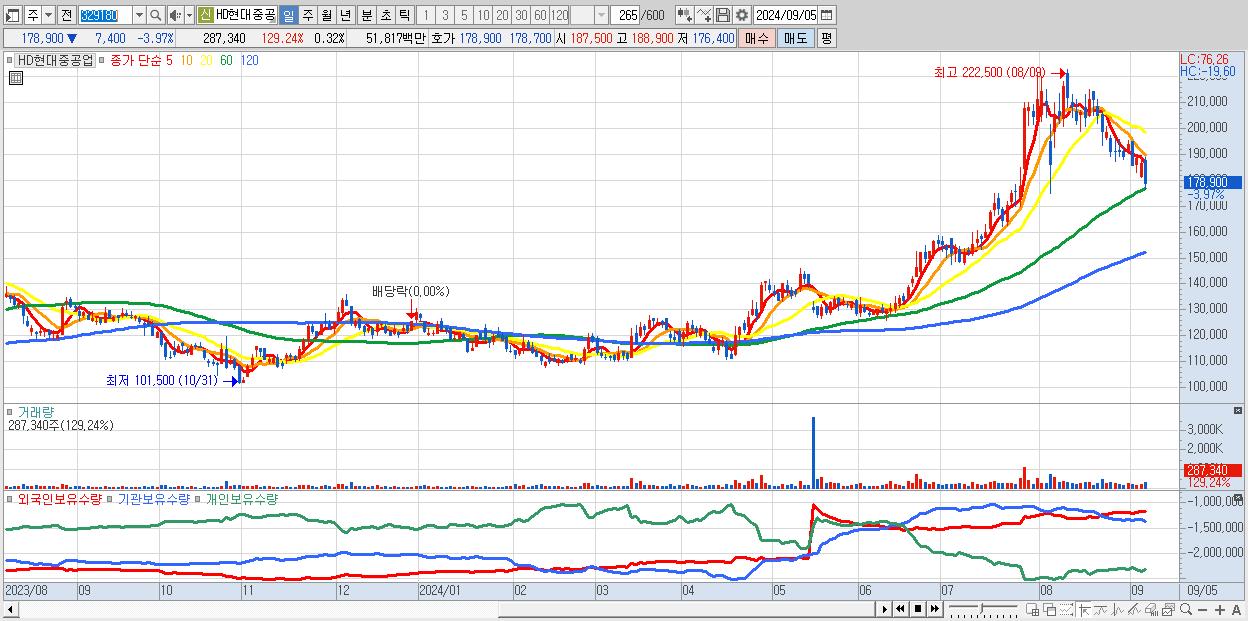 - HD현대중공업 (178,900원 ▼ -3.97% , 시총: 158,815억, 외국인 순매수 거래금:56억)
