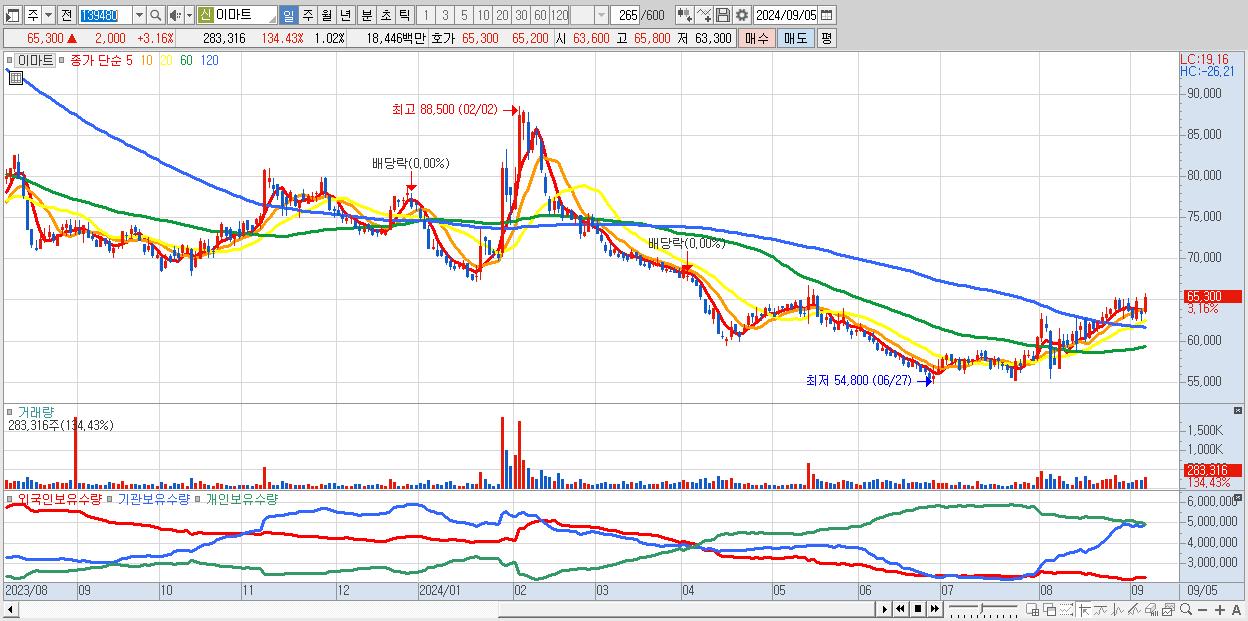 - 이마트 (65,300원 ▲ 3.16% , 시총: 18,203억, 외국인 순매수 거래금:46억)
