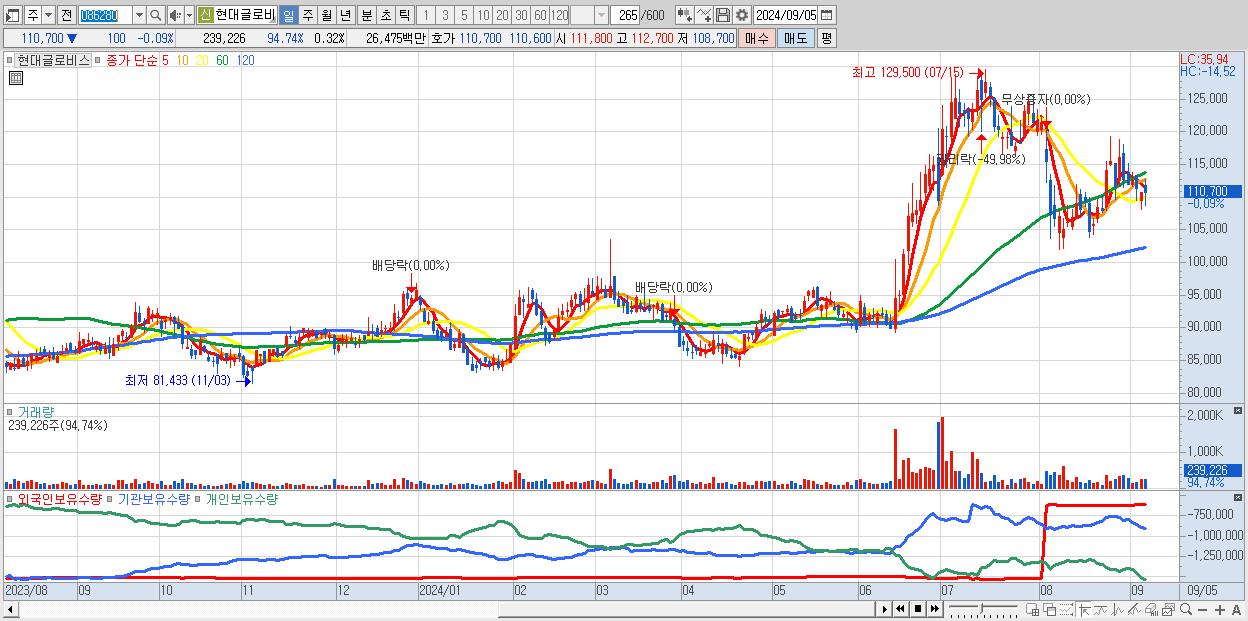- 현대글로비스 (110,700원 ▼ -0.09% , 시총: 83,025억, 외국인 순매수 거래금:50억)
