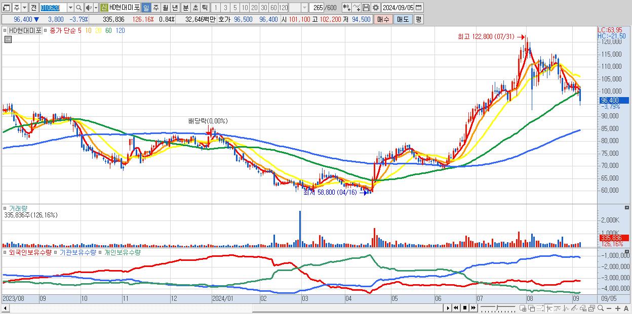 - HD현대미포 (96,400원 ▼ -3.79% , 시총: 38,504억, 외국인 순매수 거래금:46억)