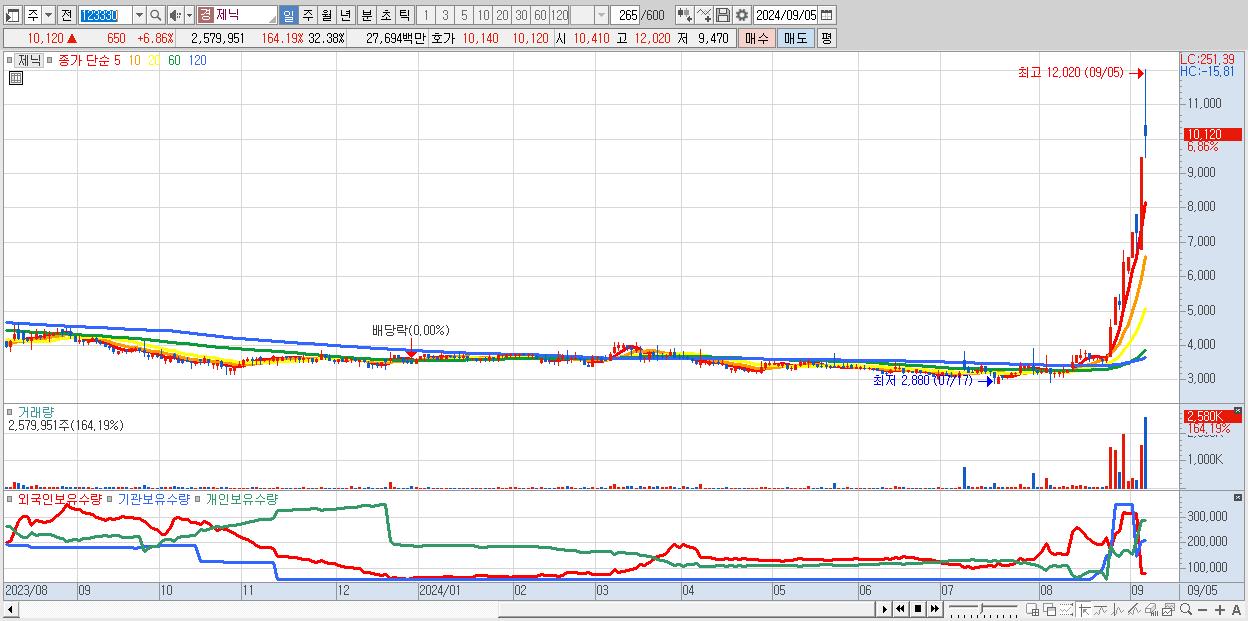 - 제닉 (10,120원 ▲ 6.86% , 시총: 806억, 거래량: 2,579,951, 거래대금:277억, KOSDAQ)