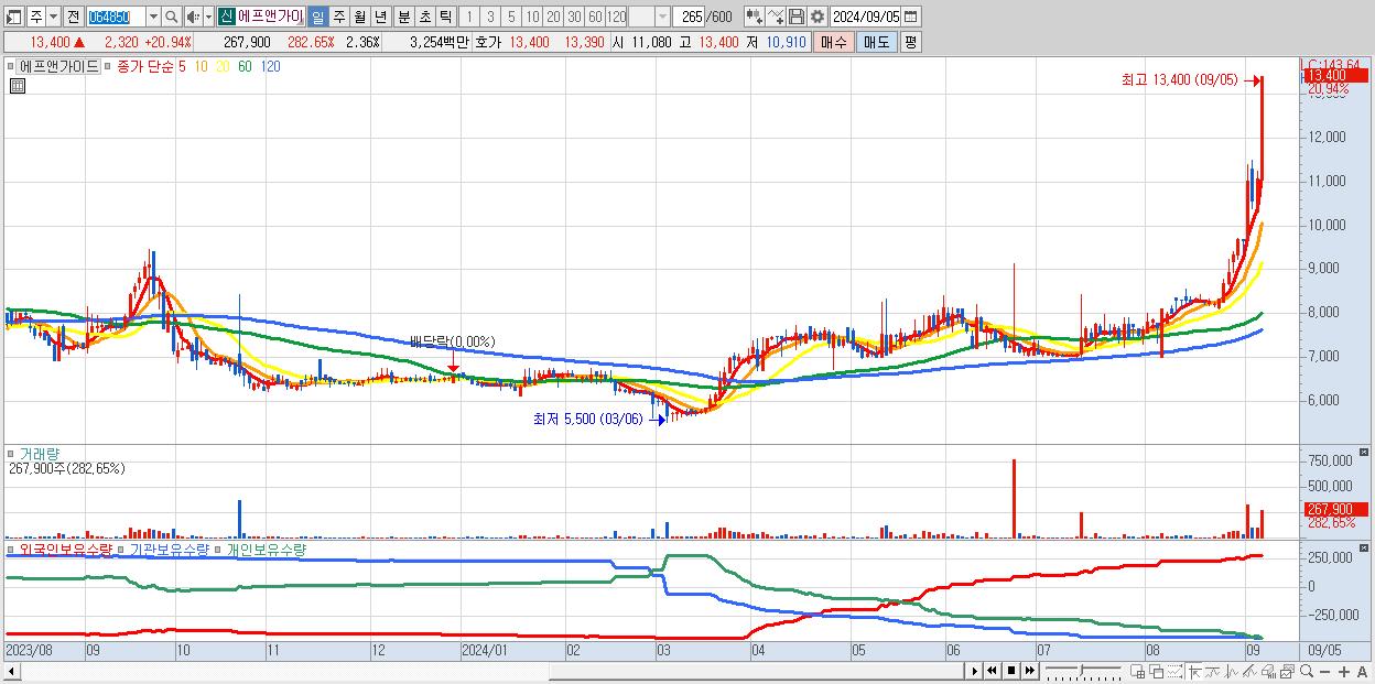 - 에프앤가이드 (13,400원 ▲ 20.94% , 시총: 1,521억, 거래량: 267,900, 거래대금:33억, KOSDAQ)