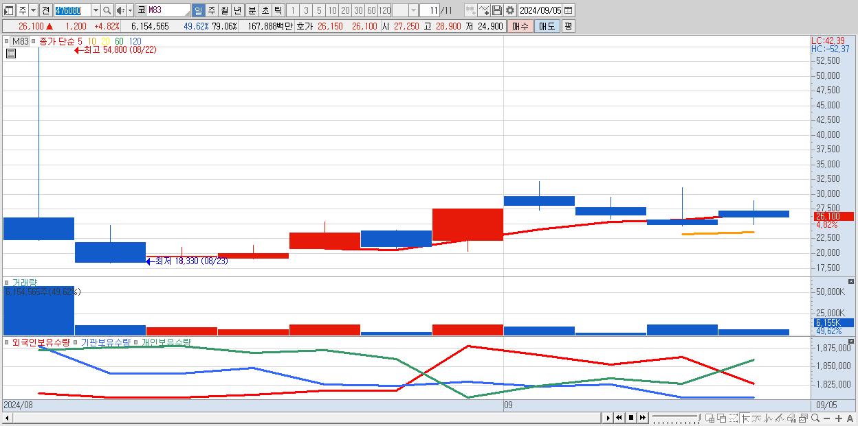 - M83 (26,100원 ▲ 4.82% , 시총: 2,032억, 거래량: 6,154,565, 거래대금:1,679억)