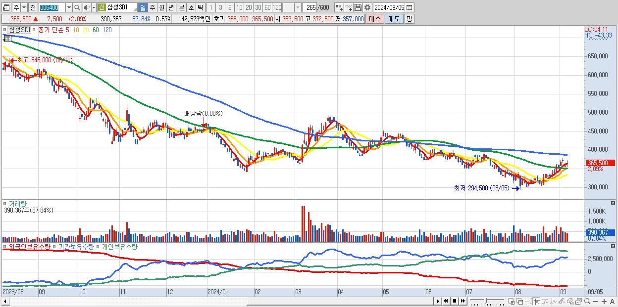 - 삼성SDI (365,500원 ▲ 2.09% , 시총: 251,334억, 거래량: 390,367, 거래대금:1,426억)