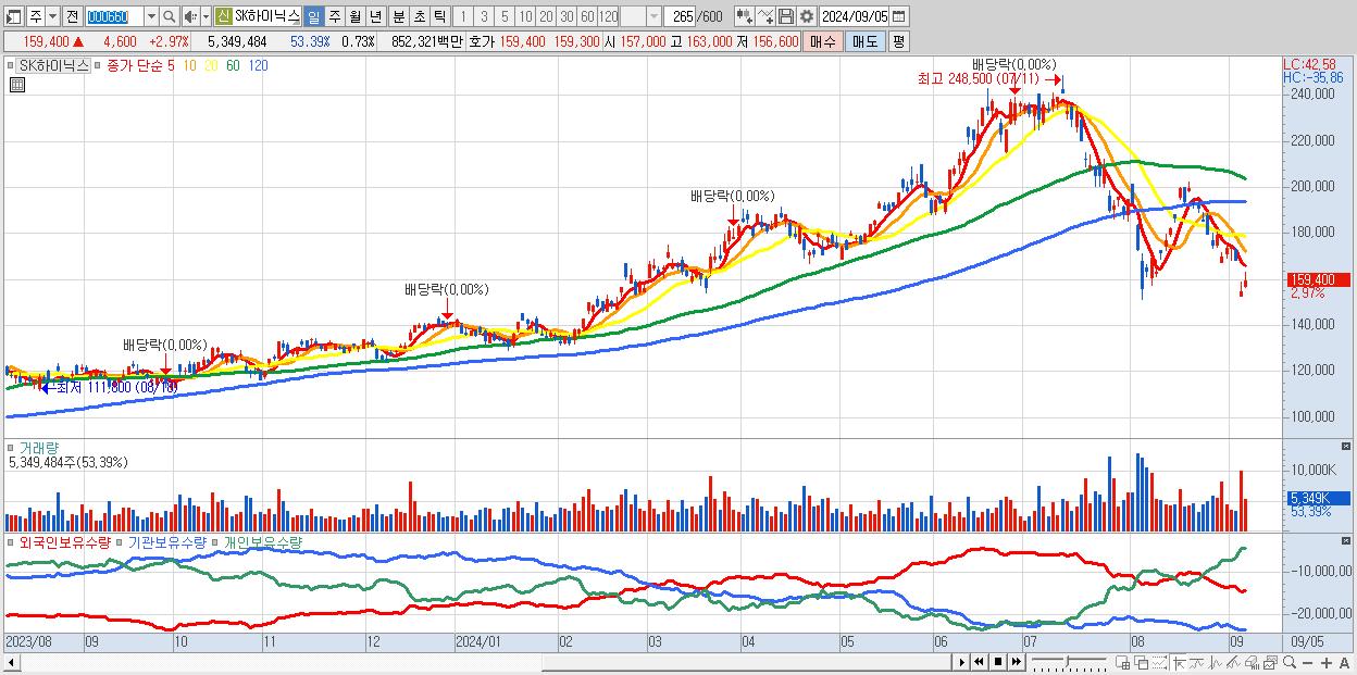 - SK하이닉스 (159,400원 ▲ 2.97% , 시총: 1,160,436억, 거래량: 5,349,484, 거래대금:8,523억)