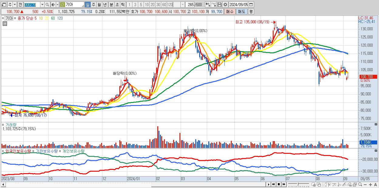 - 기아 (100,700원 ▲ 0.5% , 시총: 402,657억, 거래량: 1,103,725, 거래대금:1,116억)