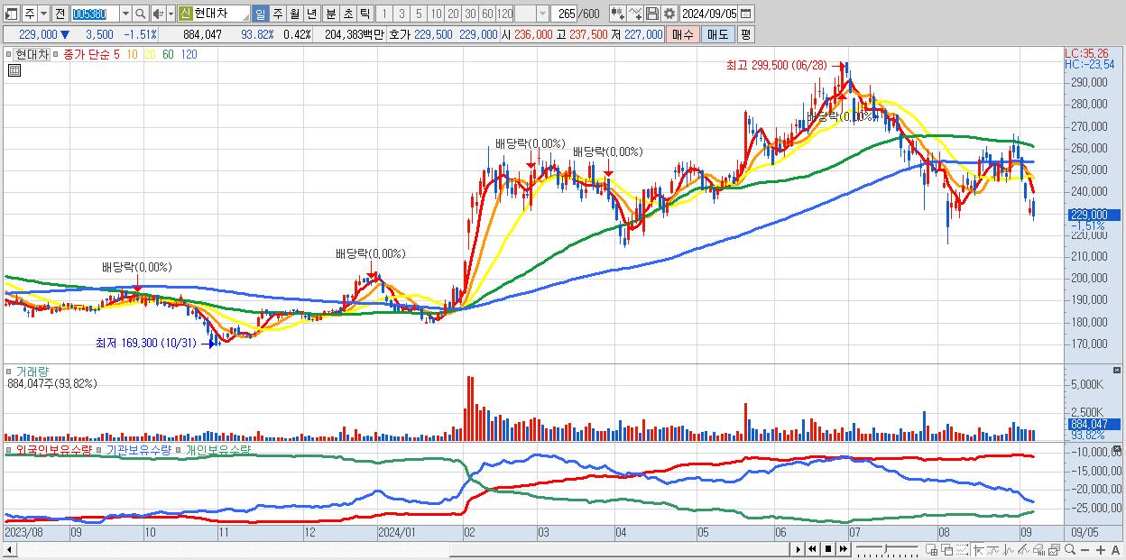 - 현대차 (229,000원 ▼ -1.51% , 시총: 479,563억, 거래량: 884,047, 거래대금:2,044억)