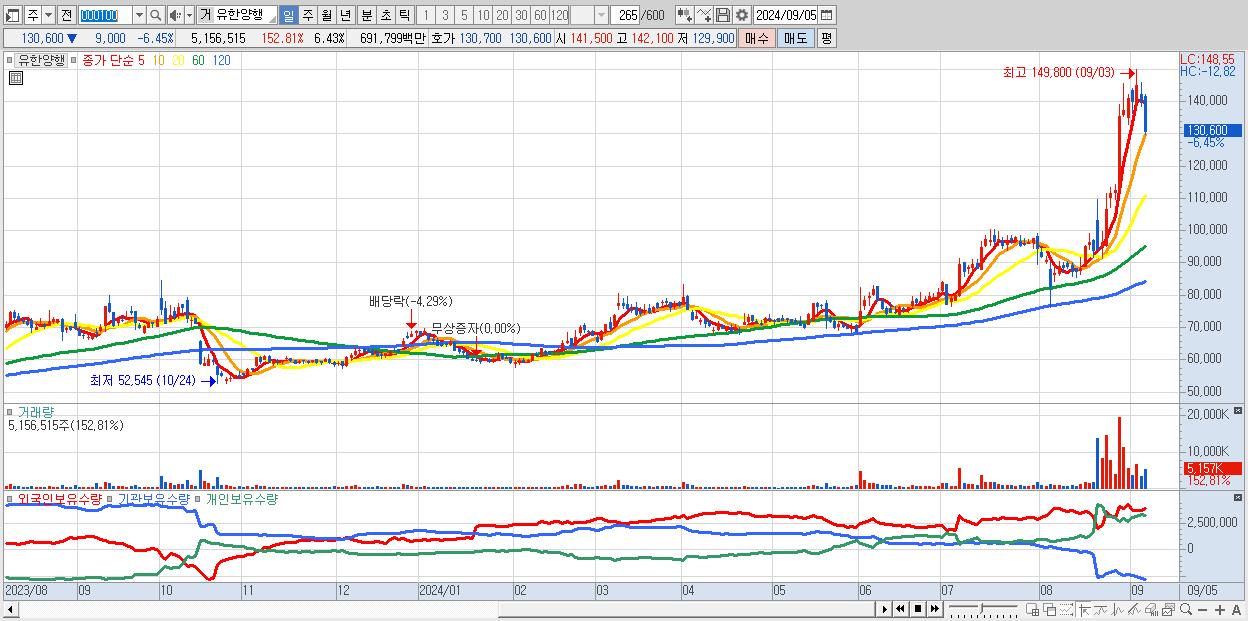 - 유한양행 (130,600원 ▼ -6.45% , 시총: 104,753억, 거래량: 5,156,515, 거래대금:6,918억)
