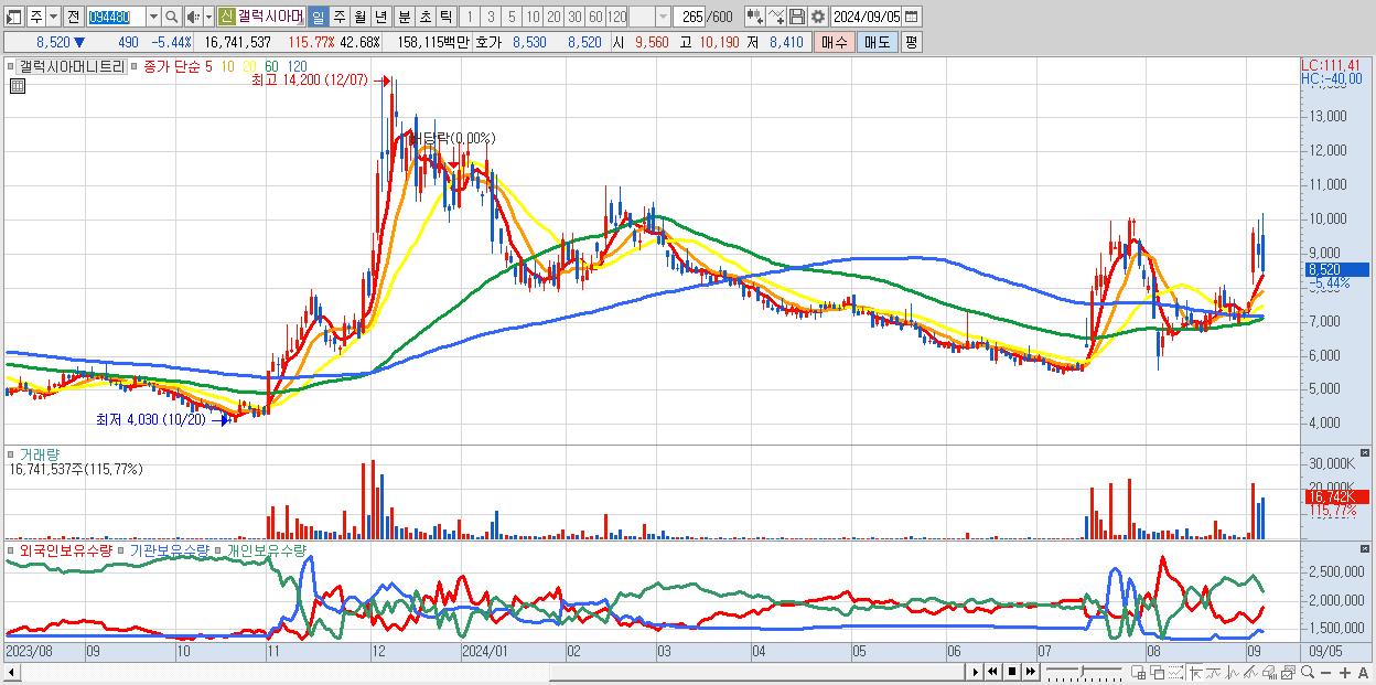 시총: 1,160,436억 거래량: 5,349,484 거래대금:8,523억 업종:전기전자