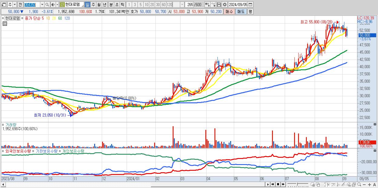 - 현대로템 (50,800원 ▼ -3.61% , 시총: 55,444억, 거래량: 1,952,698, 거래대금:1,013억)