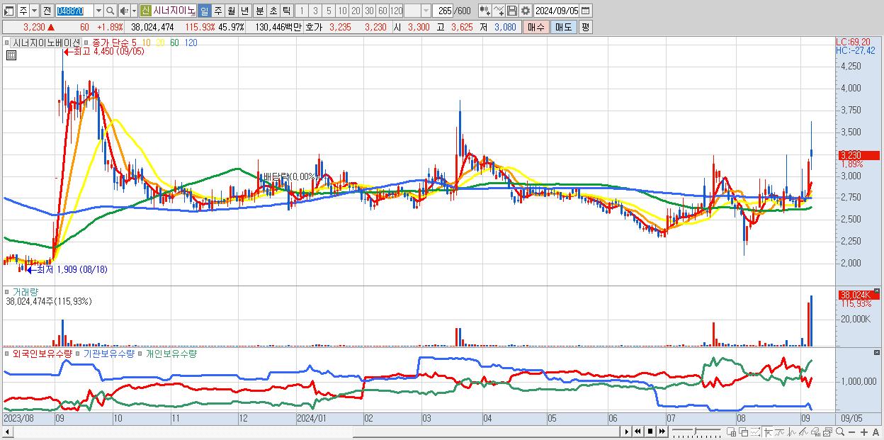 - 시너지이노베이션 (3,230원 ▲ 1.89% , 시총: 2,671억, 거래량: 38,024,474, 거래대금:1,304억)