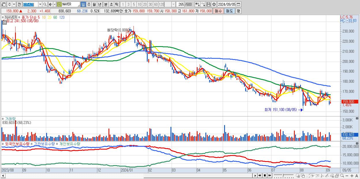- NAVER (159,800원 ▲ 1.46% , 시총: 256,934억, 거래량: 830,603, 거래대금:1,327억)