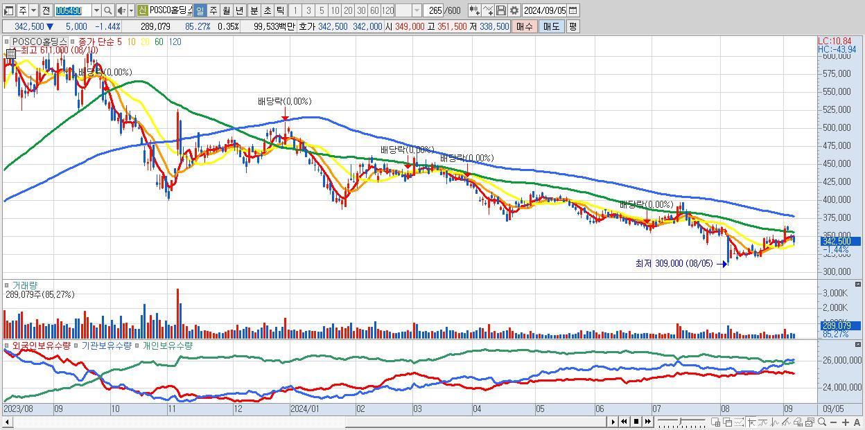 - POSCO홀딩스 (342,500원 ▼ -1.44% , 시총: 282,988억, 거래량: 289,079, 거래대금:995억)