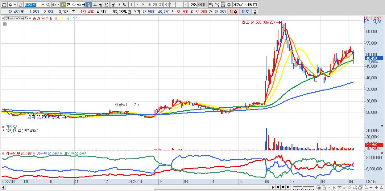 - 한국가스공사 (48,450원 ▼ -3.68% , 시총: 44,726억, 거래량: 3,975,171, 거래대금:1,940억)