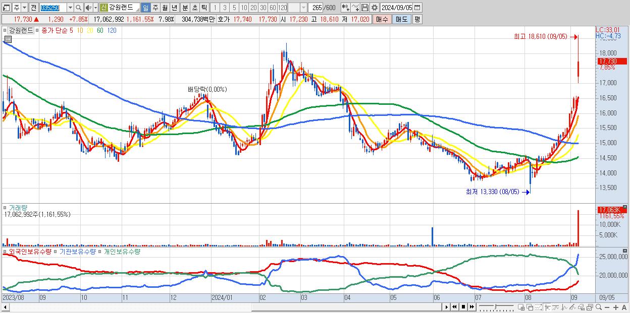 - 강원랜드 (17,730원 ▲ 7.85% , 시총: 37,932억, 거래량: 17,062,992, 거래대금:3,047억)