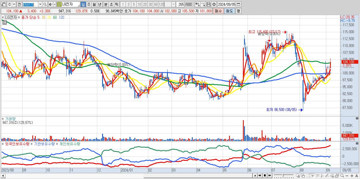 - LG전자 (104,100원 ▲ 3.38% , 시총: 170,357억, 거래량: 947,316, 거래대금:988억)