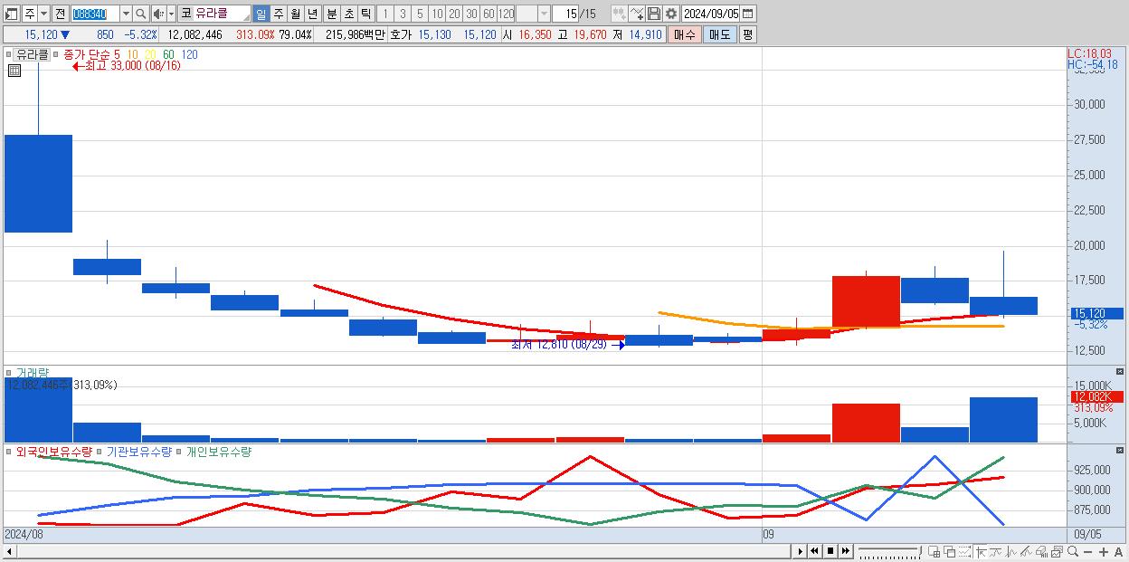 - 유라클 (15,120원 ▼ -5.32% , 시총: 655억, 거래량: 12,082,446, 거래대금:2,160억)