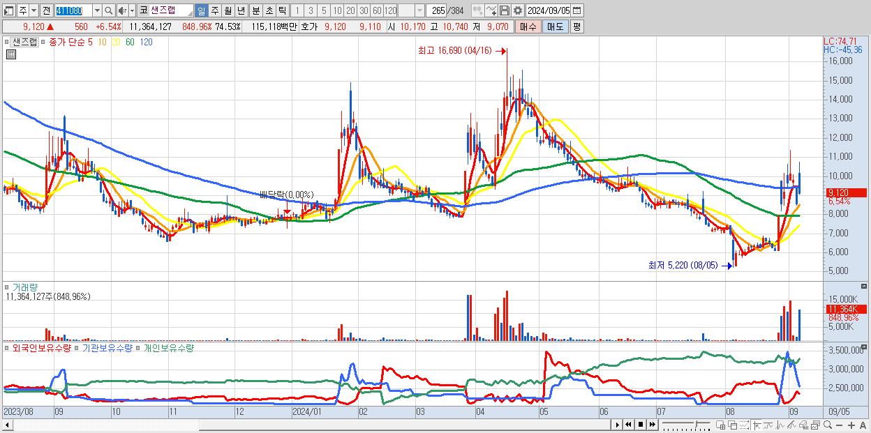 - 샌즈랩 (9,120원 ▲ 6.54% , 시총: 1,391억, 거래량: 11,364,127, 거래대금:1,151억)