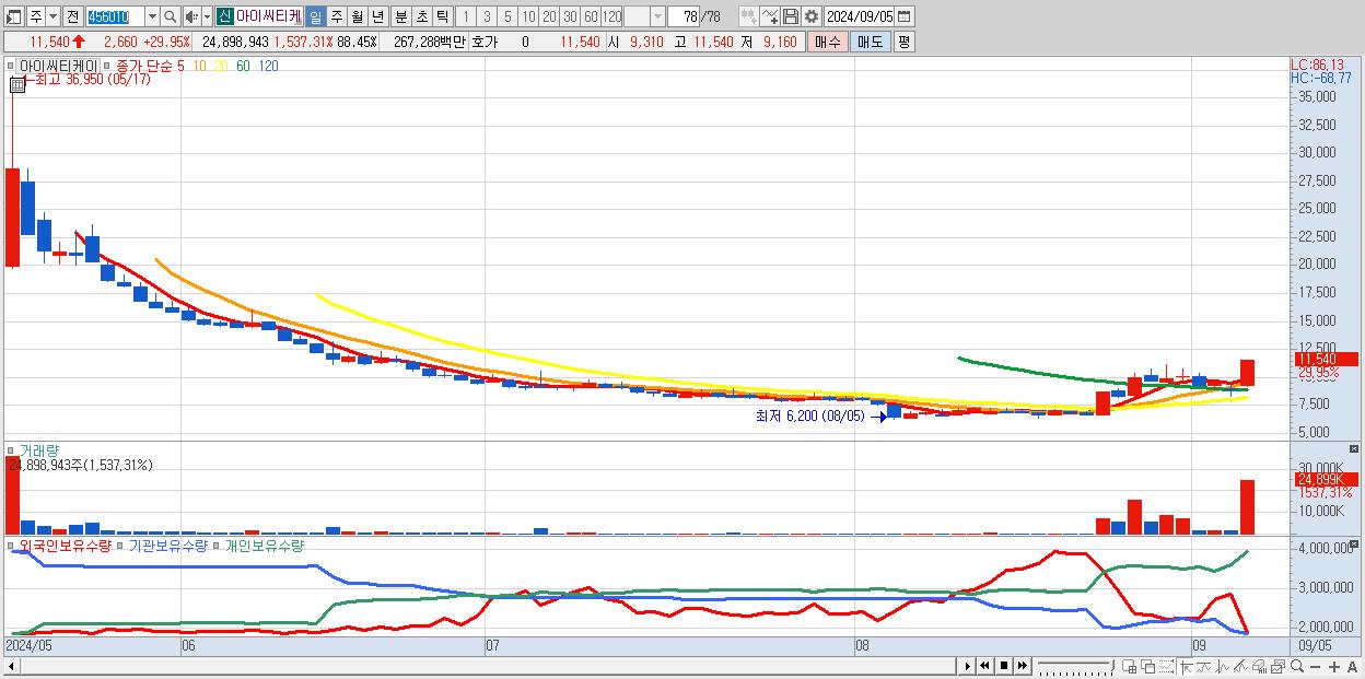 - 아이씨티케이 (11,540원 ▲ 29.95% , 시총: 1,525억, 거래량: 24,898,943, 거래대금:2,673억)