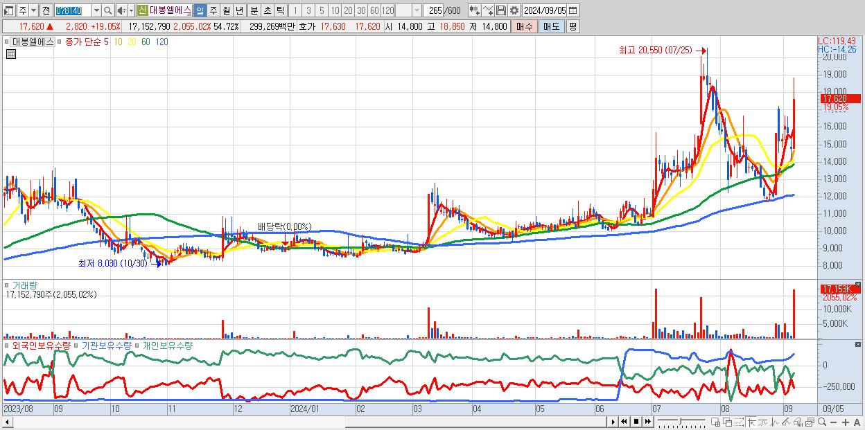- 대봉엘에스 (17,620원 ▲ 19.05% , 시총: 1,953억, 거래량: 17,152,790, 거래대금:2,993억)