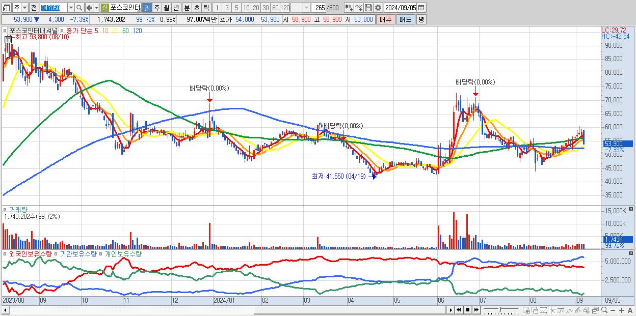 - 포스코인터내셔널 (53,900원 ▼ -7.39% , 시총: 94,822억, 거래량: 1,743,282, 거래대금:970억)